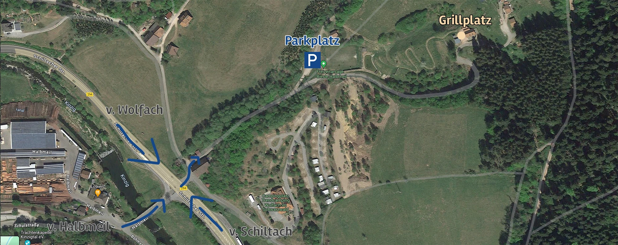 Von Hausach oder Schiltach kommend die B294 bis Halbmeil. Ausfahrt beim "Trendcamping". Dann der Beschilderung "Freizeitanlage Biesle" folgen. Der Weg befindet sich links neben dem Gebäude an der Kreuzung und dann den Berg hoch. Es gibt wenige Parkplätze oben am Haus. Bitte unten am Bolzplatz parken.
