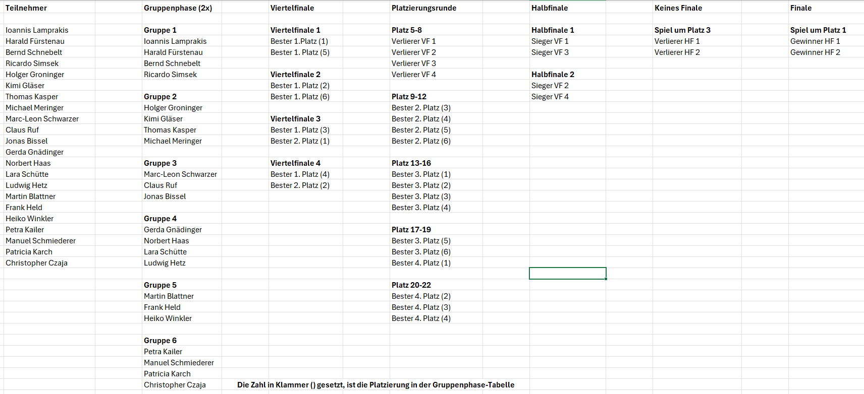 Um 17 Uhr sind wir im Irish Pub und Darten den Meister aus, haben dort den oberen Raum für uns. Um ca. 19 Uhr gehen wir in Eselsbeck zum Essen mit anschließendem Tischkickerturnier.